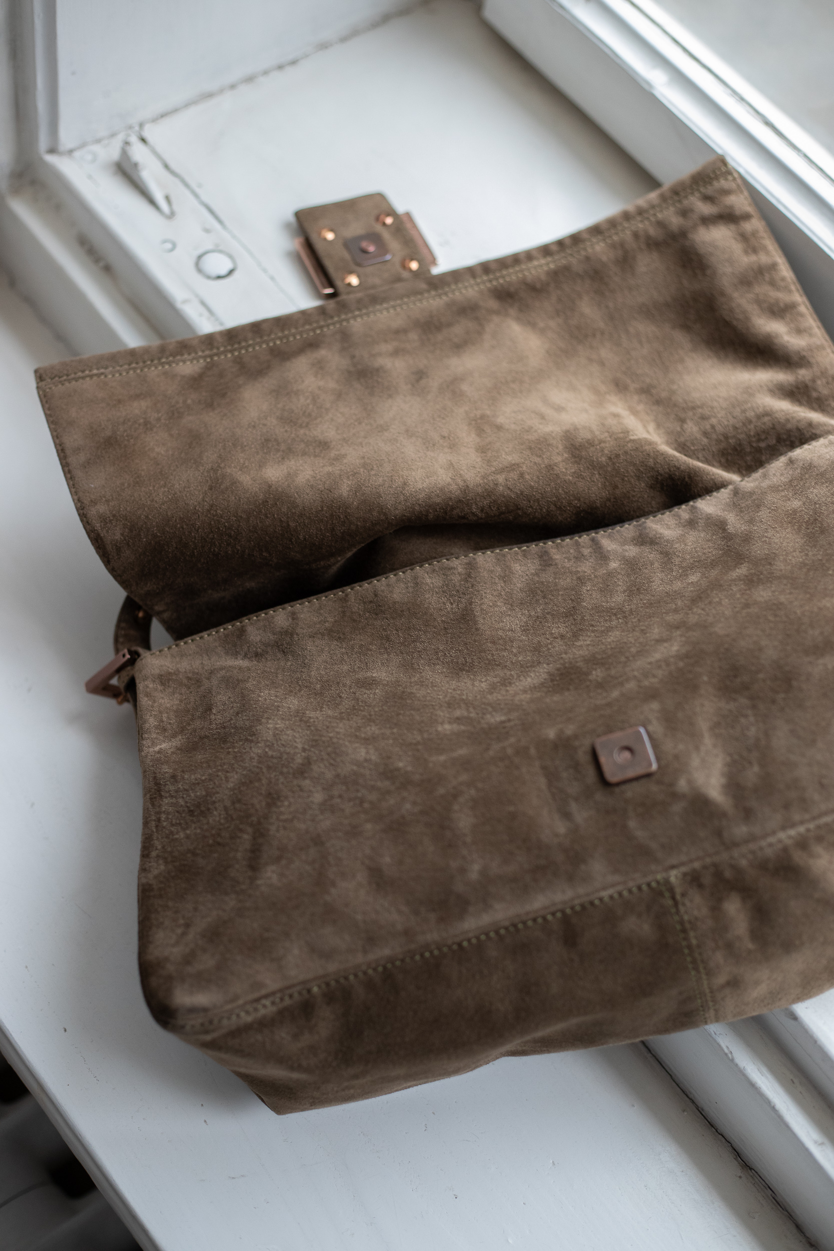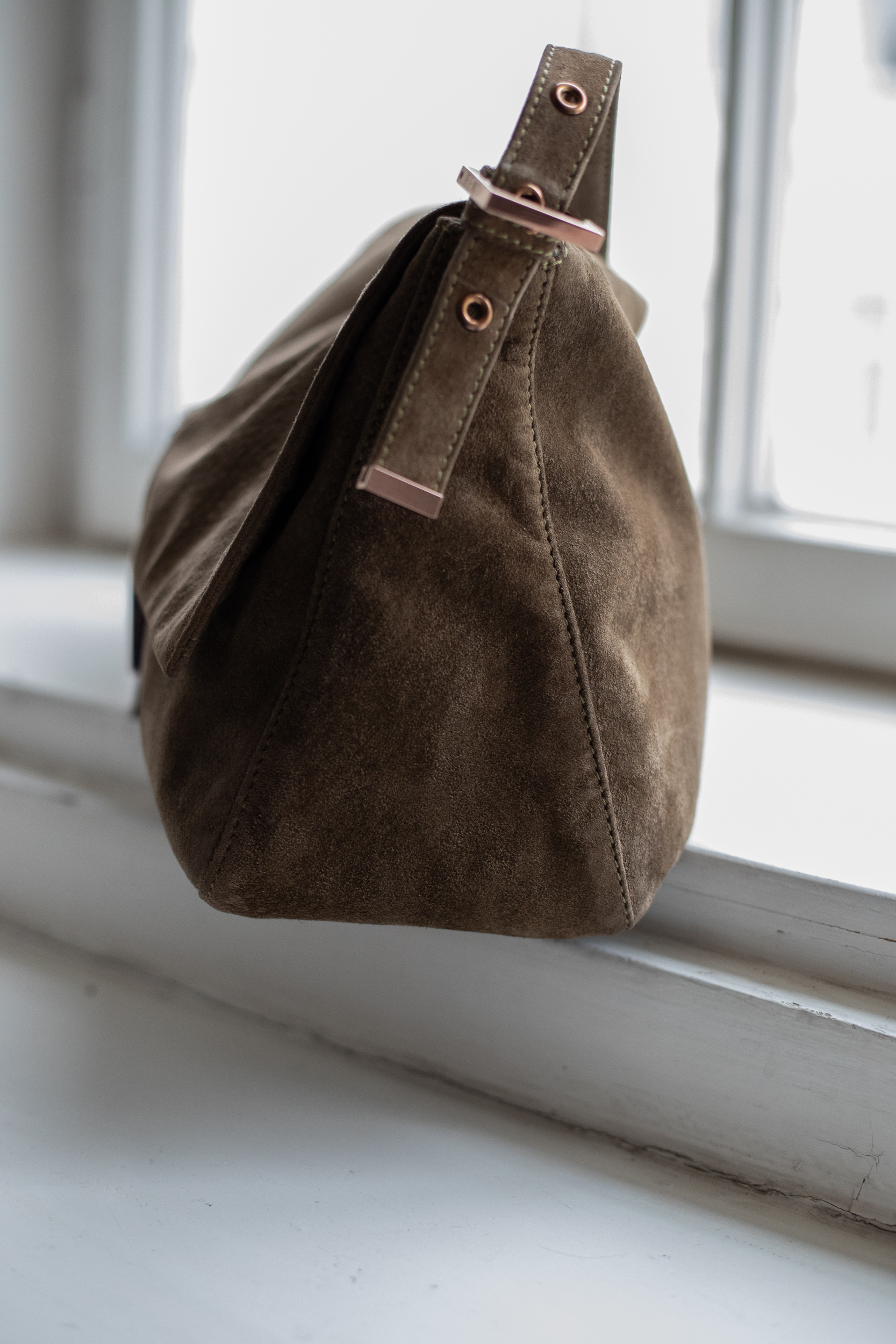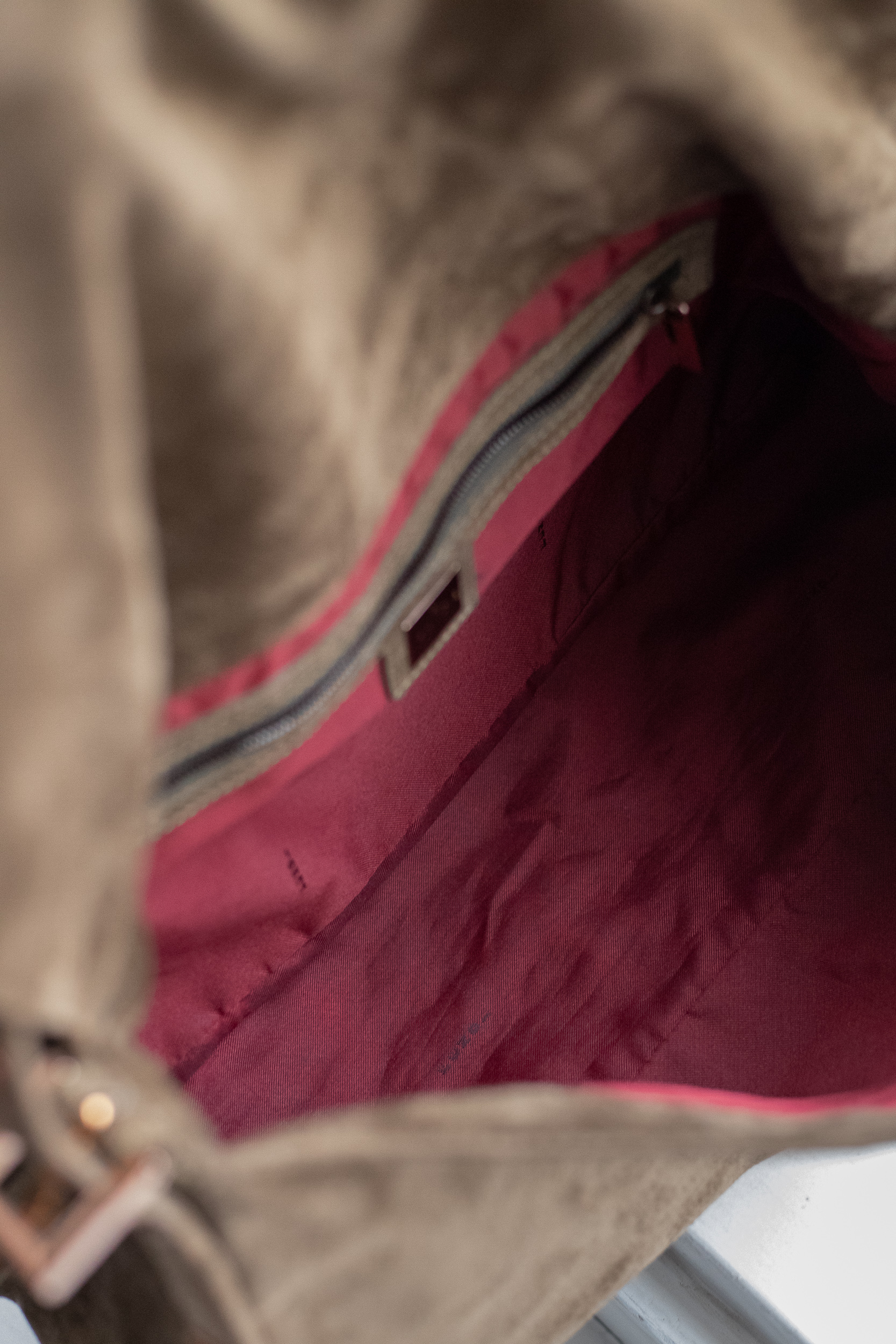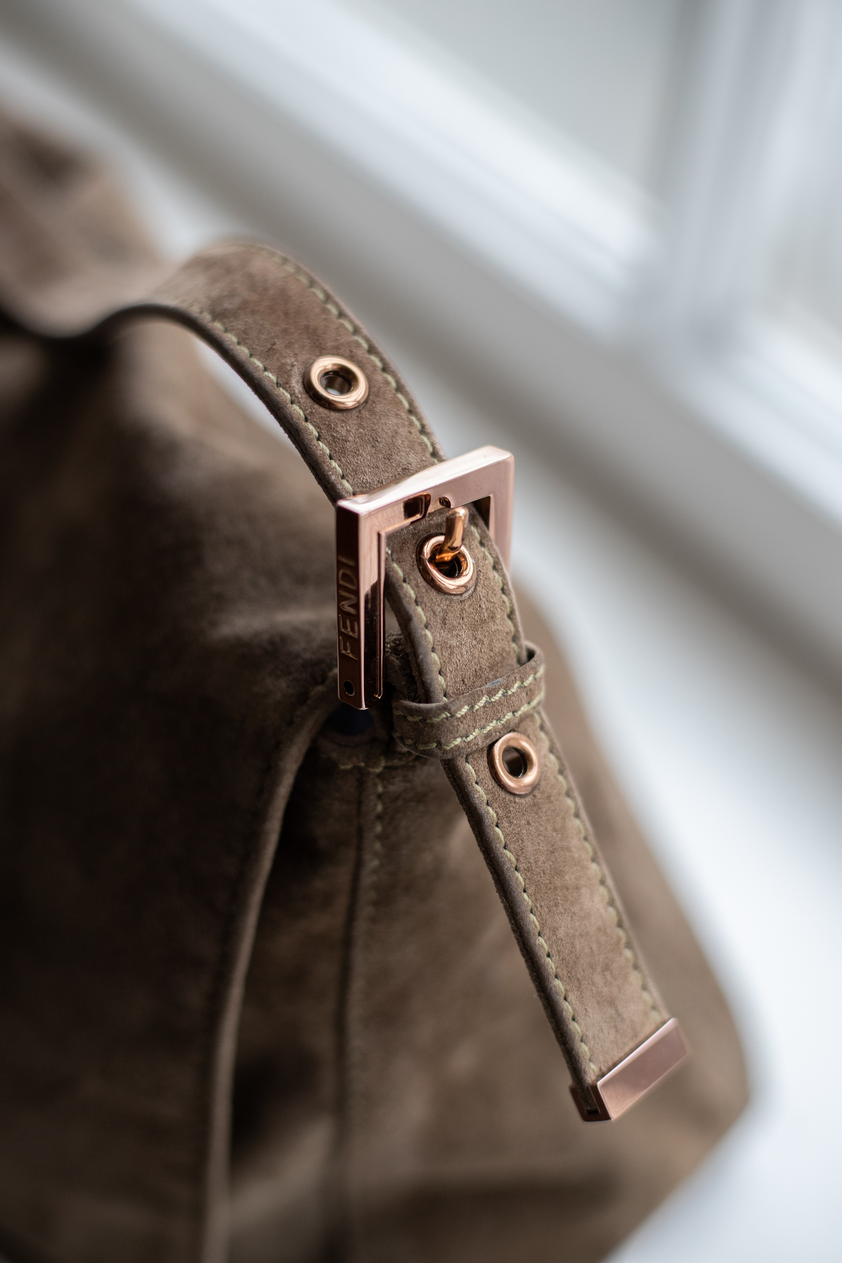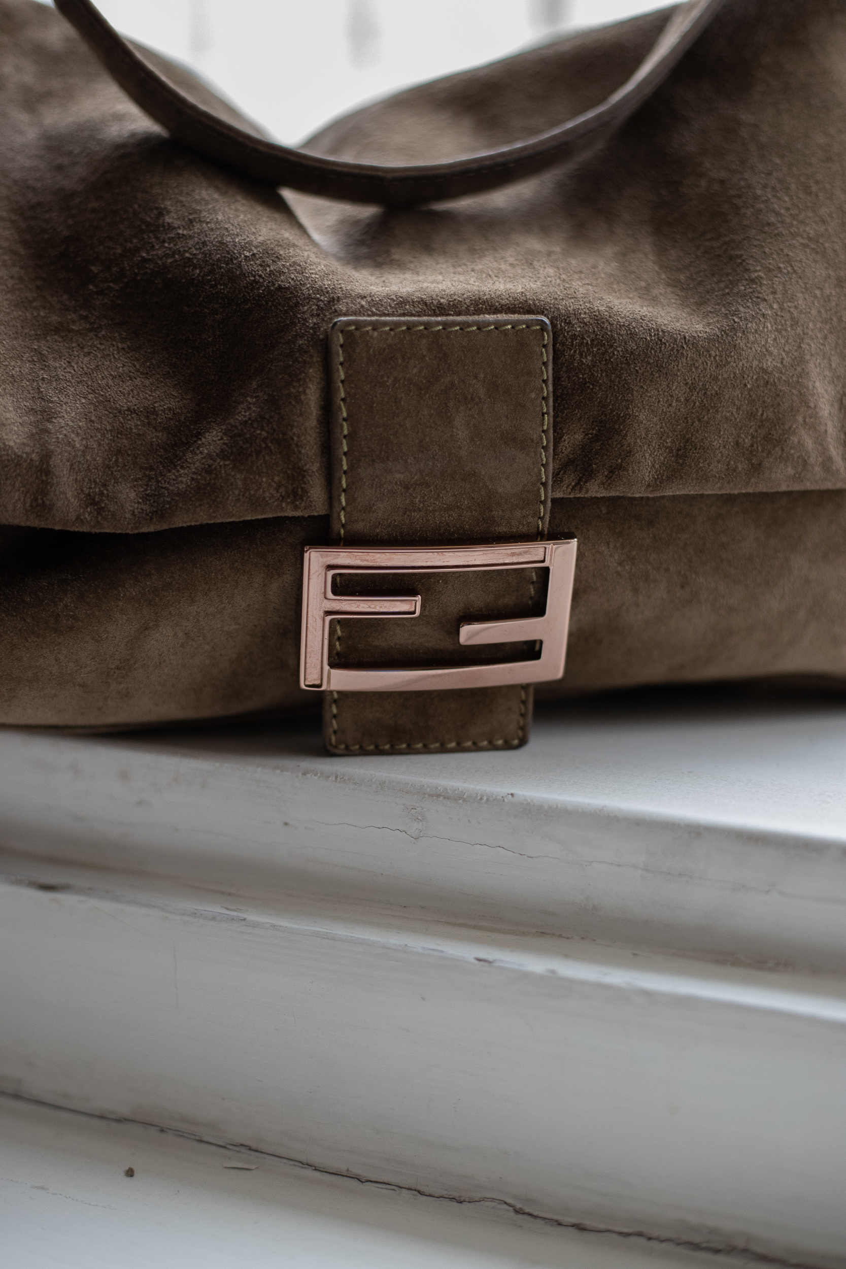 Artikelzustand (außen): Guter Zustand, leichte Gebrauchsspuren an Wildleder und Hardware. Hardware in Gold, eine Seite vom F-Logo hatte ursprünglich eine grüne Füllung.
